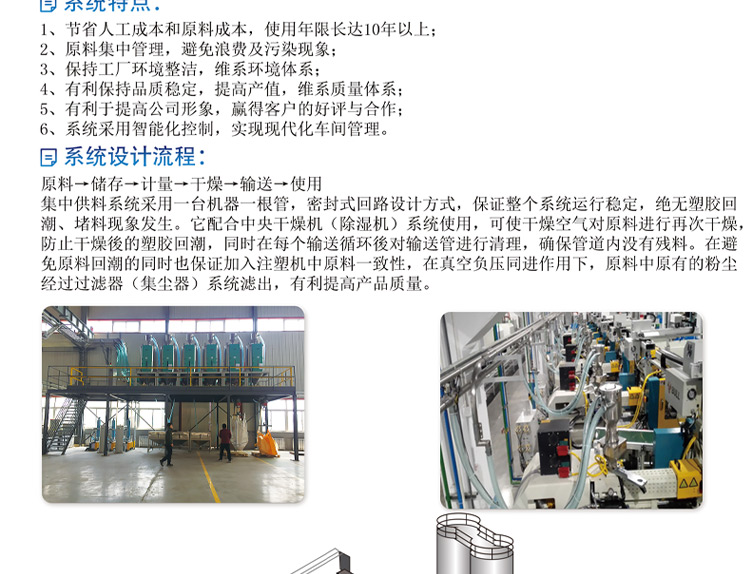 • 集中供料系統(tǒng)特點(diǎn):  1、節(jié)省人工成本和原料成本,使用年限長達(dá)10年以上;  2、原料集中管理,避免浪費(fèi)及污染現(xiàn)象;  3、保持工廠環(huán)境整潔,維系環(huán)境體系;  4、有利保持品質(zhì)穩(wěn)定,提高產(chǎn)值,維系質(zhì)量體系;  5、有利於提高公司形象,贏得客戶好評與合作。